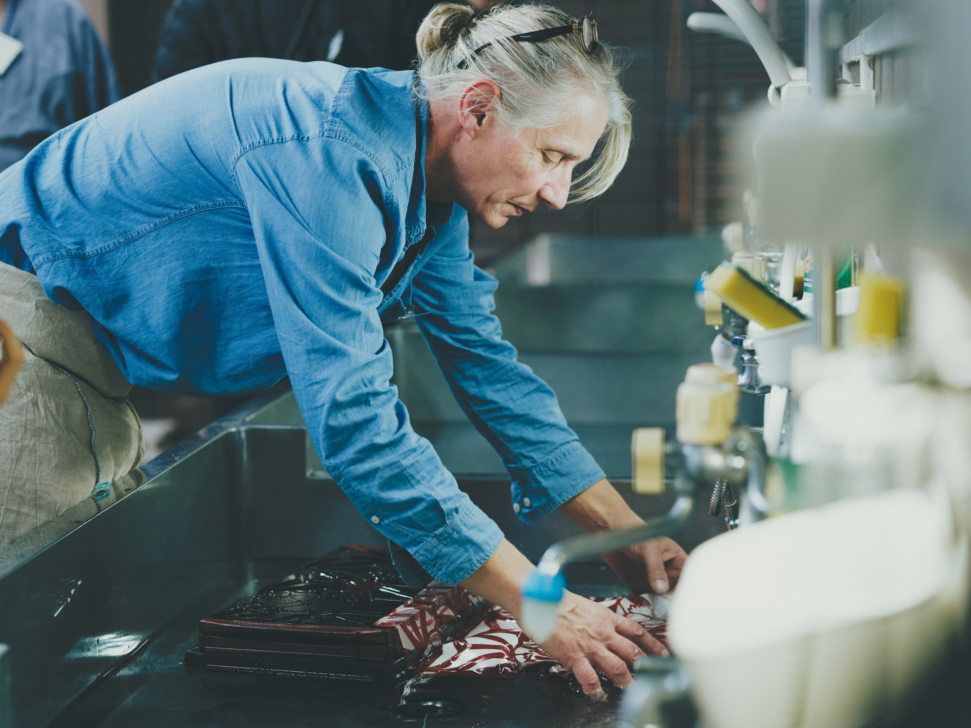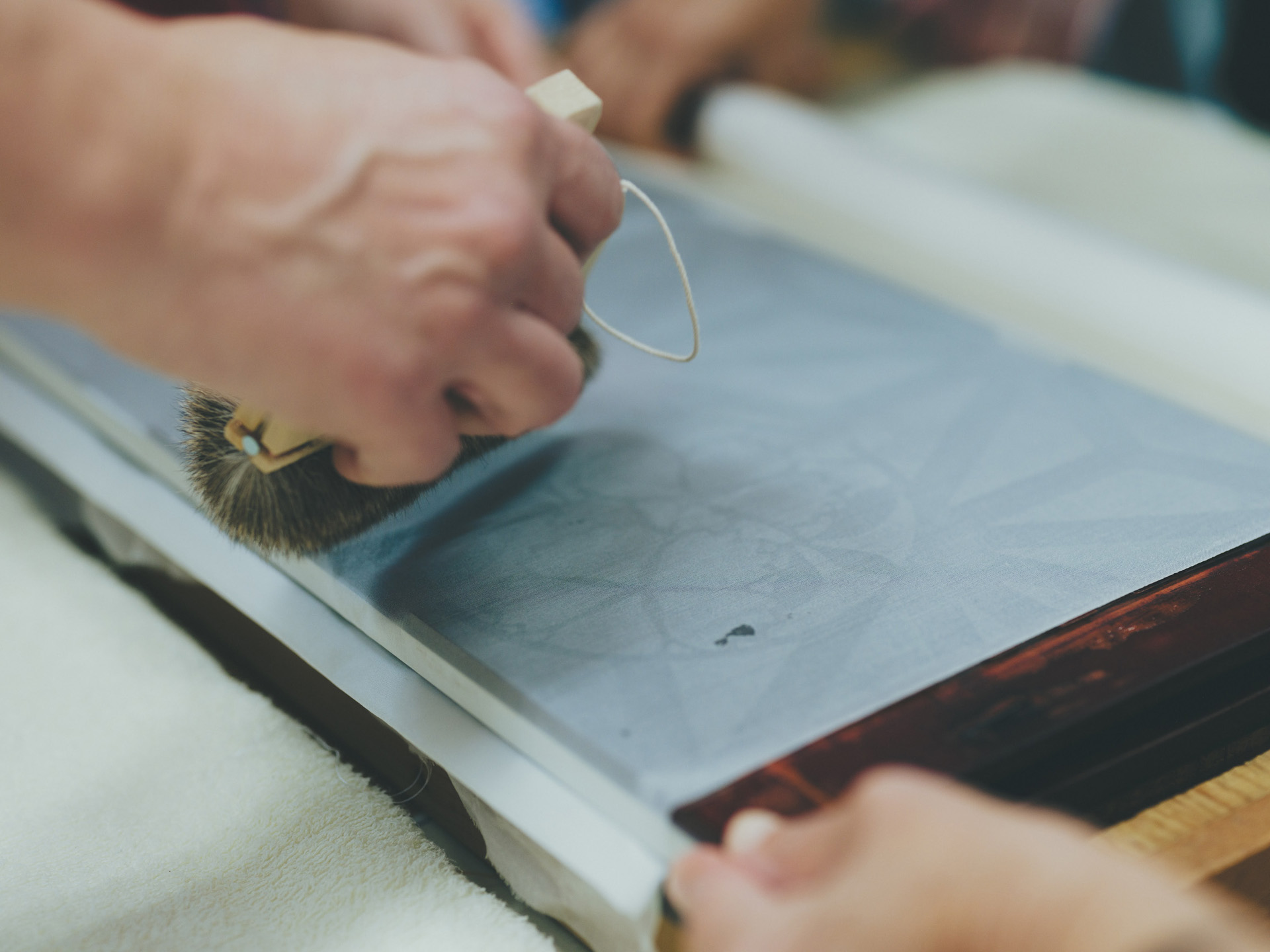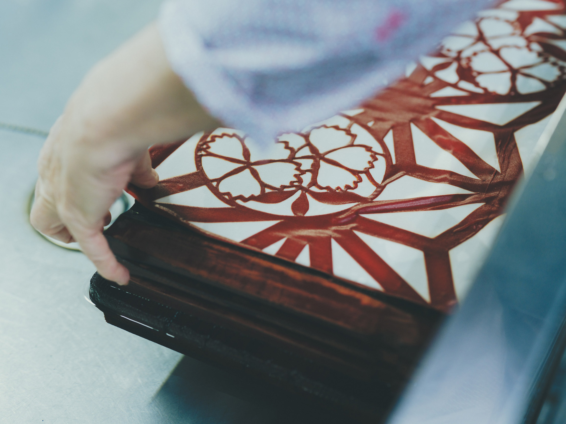 Grâce à des recherches initiées par Haruko YOSHIMURA, de la 6ème génération d’une famille de spécialistes du Beni Itajime Shibori, une méthode de teinture par réserve a été redécouverte. Dans cette technique, des motifs sont gravés sur des planches de bois. Ensuite, la soie est pliée et comprimée entre ces bois avant d’être teinte. Nous avons eu le privilège de participer à une reconstitution, organisée en partenariat avec le jardin des plantes tinctoriales de Takasaki et l’association de Yoshimura appelée Beni no Kai. Cette journée de teinture exceptionnelle nous a permis d’obtenir une pièce incroyable d’un rouge garance profond, avec des motifs parfaitement dessinés grâce aux bois gravés.