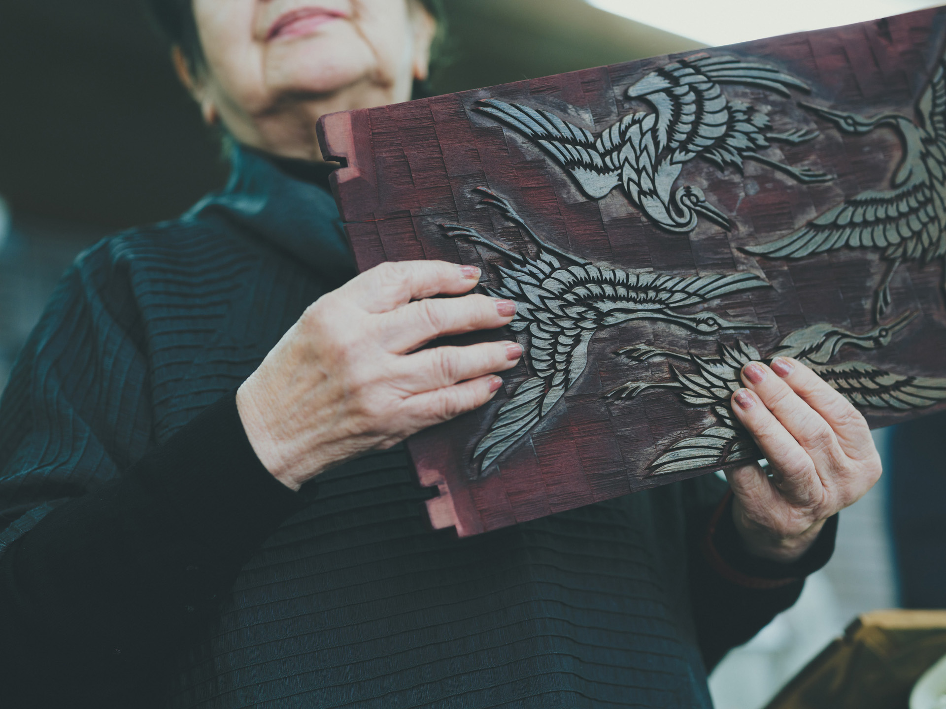 Grâce à des recherches initiées par Haruko YOSHIMURA, de la 6ème génération d’une famille de spécialistes du Beni Itajime Shibori, une méthode de teinture traditionnelle du carthame (Beni) par réserve a été redécouverte. Dans cette technique, des motifs sont gravés sur des planches de bois. Ensuite, la soie est pliée et comprimée entre ces bois avant d’être teinte.