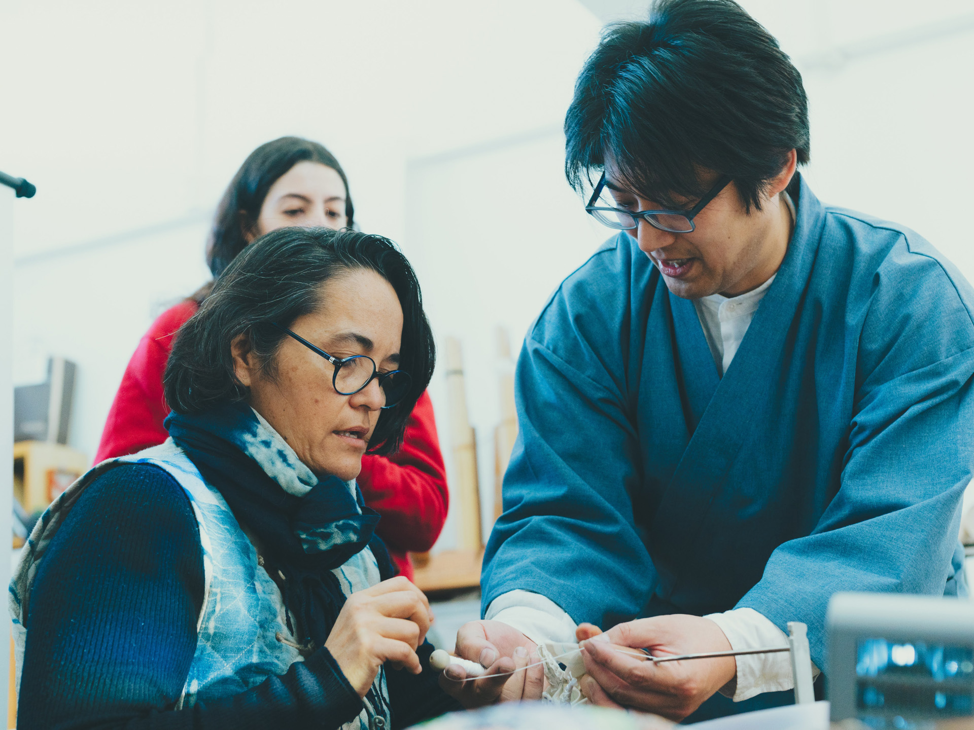 Du 20 novembre au 6 décembre 2023, nous avons eu la chance de suivre une formation exceptionnelle au Beni Itajime Shibori, une méthode de teinture par réserve, animée par Haruko YOSHIMURA, héritière de cet atelier et des spécialistes du jardin des plantes tinctoriales de Takasaki. Nous avons poursuivi notre formation à Kusaki Kobo, par un stage de quatre jours de découverte de la teinture végétale japonaise, dirigé par Kazuki YAMAZAKI maître teinturier et chercheur. À Arimatsu, capitale du Shibori, l’artisan Hiroaki KUNO nous a formé au Shibori 3D a en nous accueillant dans son entreprise historique et innovante Shibori Dyeing Kuno Studio.