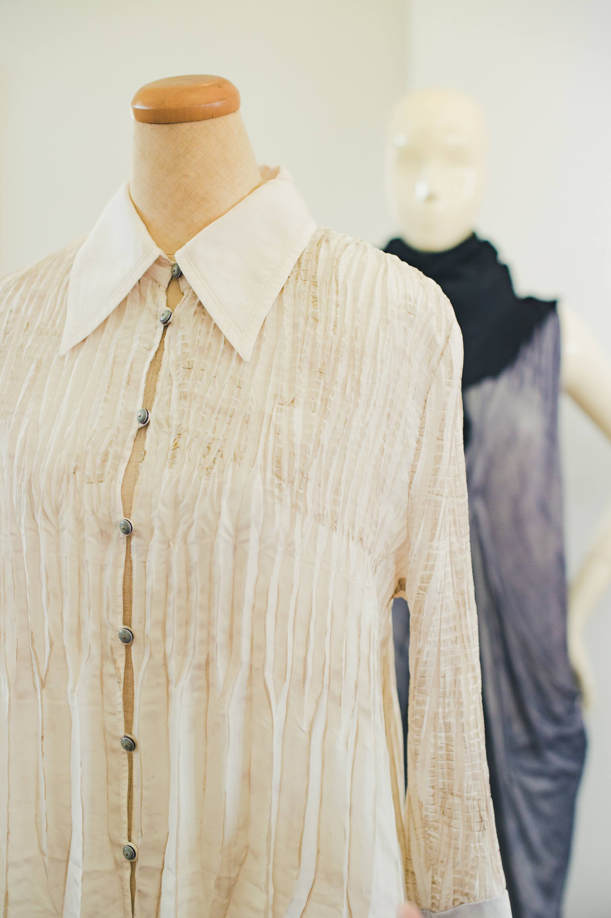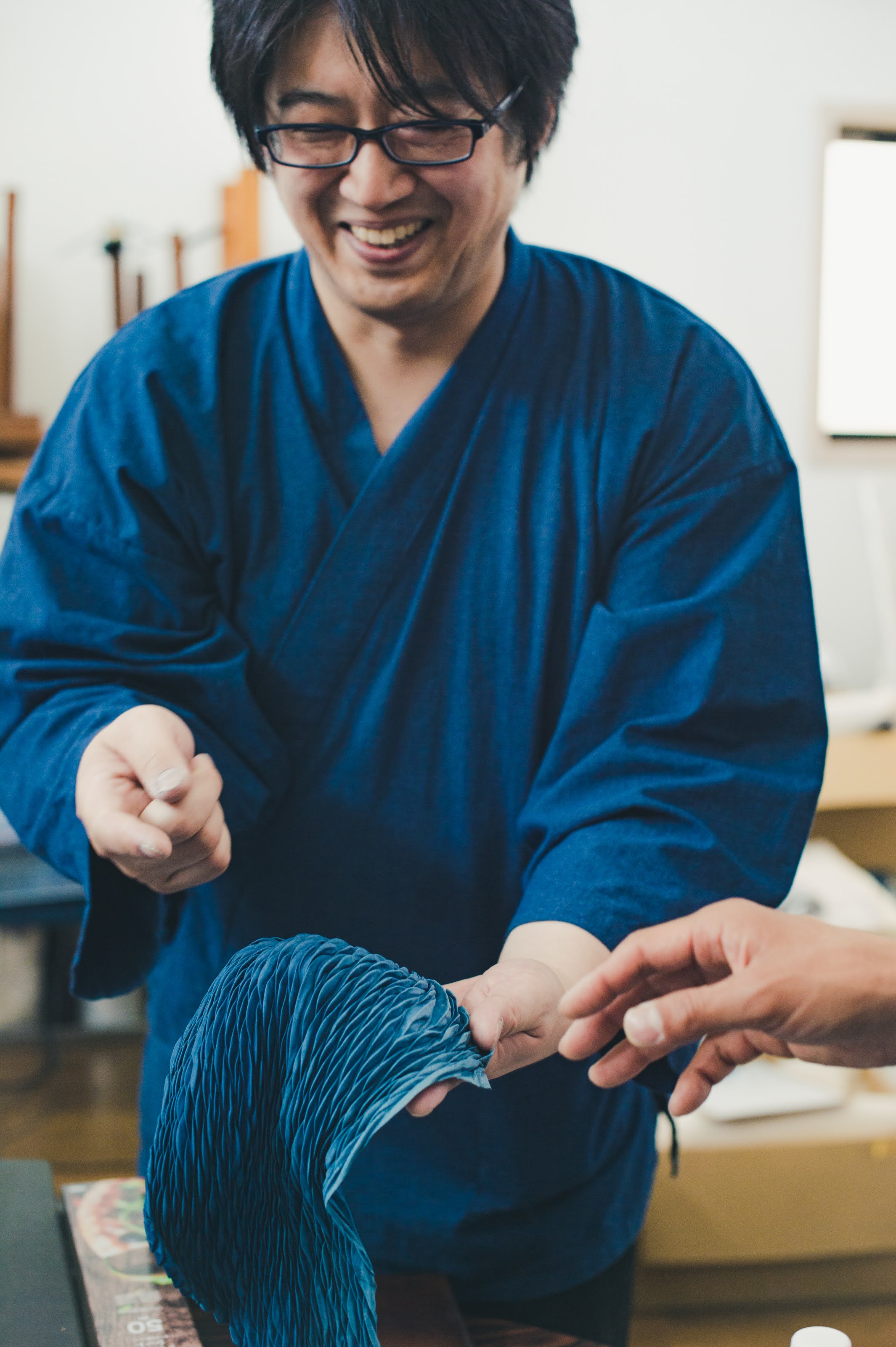 Hiroaki Kuno, représentant la 5ème génération du Shibori Dyeing Kuno Studio à Arimatsu, perpétue la tradition familiale en menant des recherches esthétiques et en explorant les possibilités du Shibori, notamment pour fixer le Shibori 3D, fruit de collaborations avec de grands couturiers renommés. Nous avons eu le privilège d’utiliser cette machine tout en explorant divers motifs de Shibori pour créer des reliefs sur le tissu. Nous avons également découvert l’histoire d’Arimatsu et participé à l’ambiance chaleureuse et familiale du festival du Shibori.