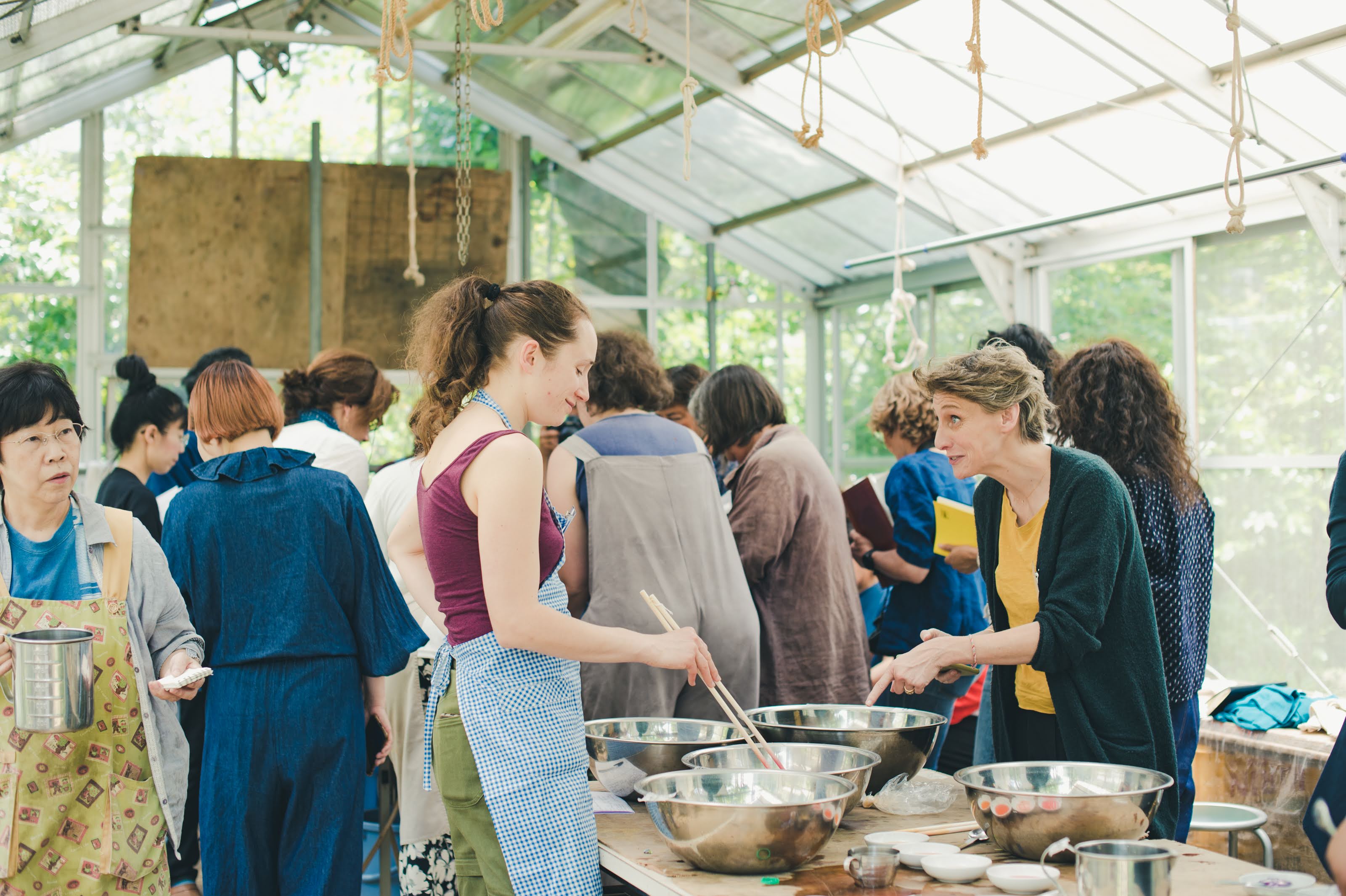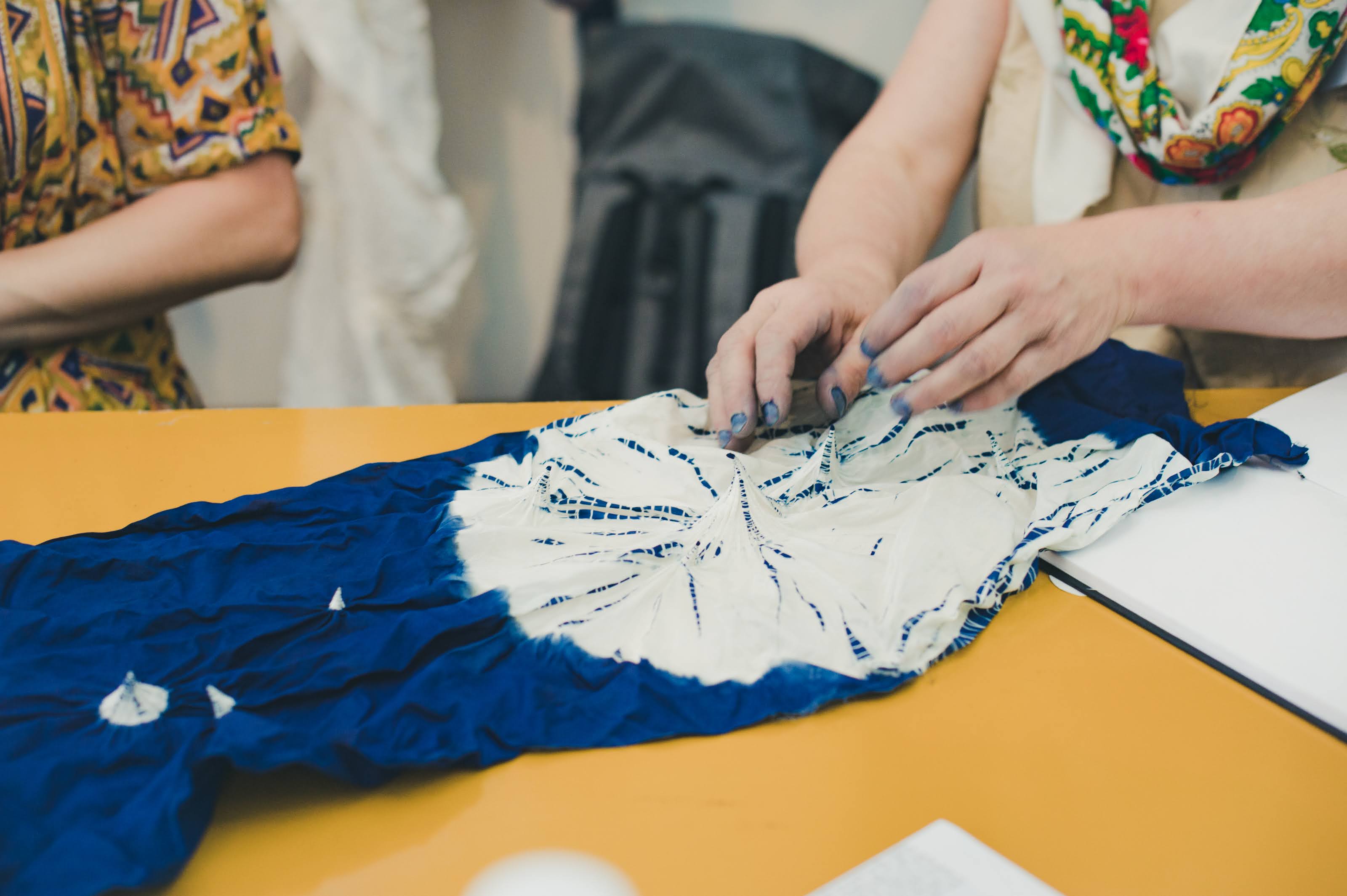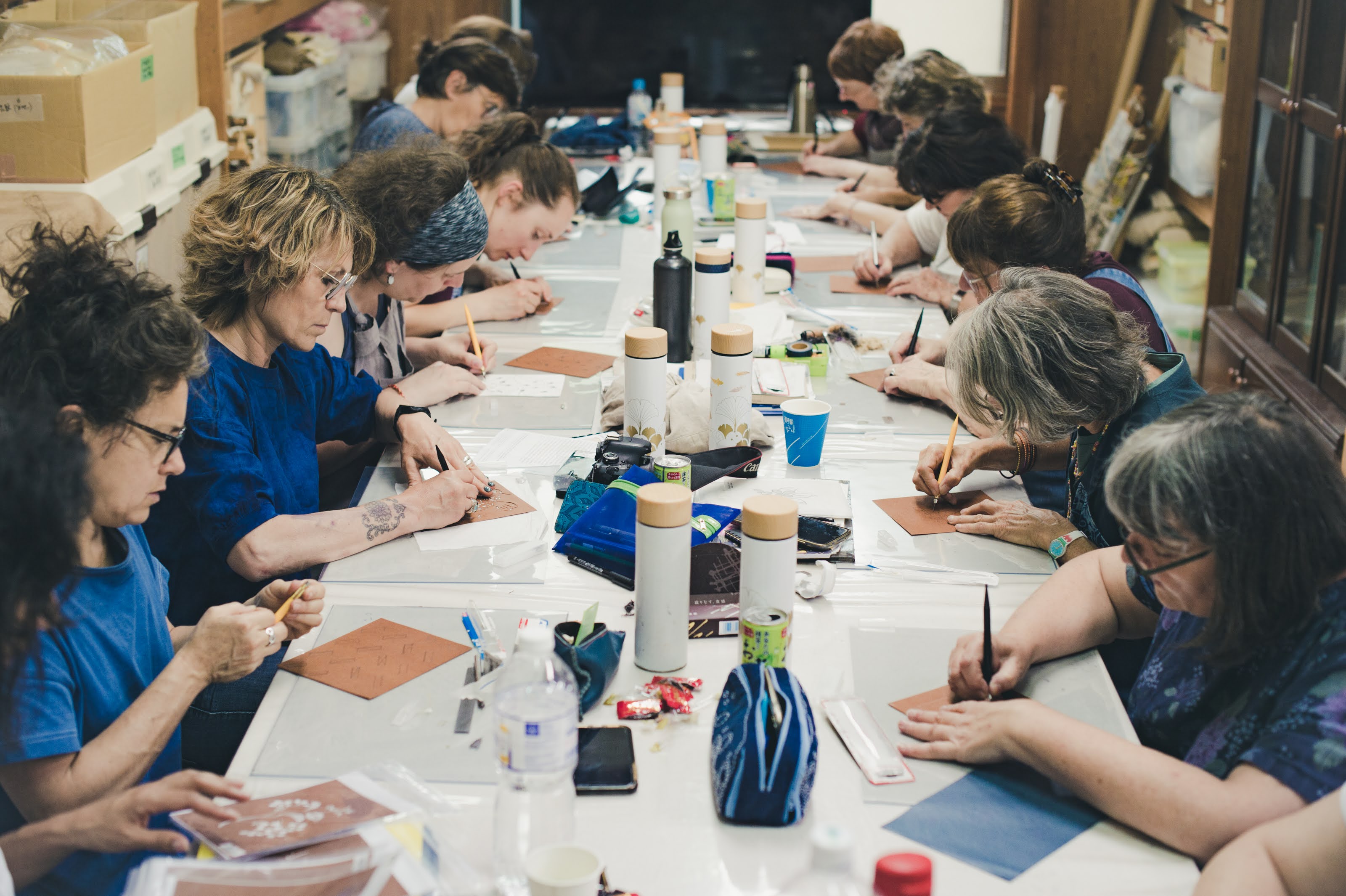 Ce sont les connaissances accumulées par quatre générations de teinturiers que nous ont enseignés Kazuki Yamazaki et son fils Hiroki. Grâce à leur expertise en chimie et en botanique, nous avons appris à tirer le meilleur parti de chaque plante japonaise, telles que la Garance japonaise, le Carthame, le Murasaki, le Kakishibu, etc. Nous avons exploré les procédés de mordançage japonais pour lesquels l’alternance mordançage/teinture est différente de notre approche européenne. Ils nous enseignent également l’art du Surizome, la fabrication de pigments végétaux, le découpage de pochoirs en papier japonais et l’utilisation de pinceaux spécifiques.